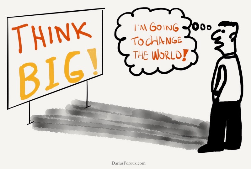 But on the other side of that, we have “thinking big.” However, thinking big can turn around and bite you in the ass. It’s delusional to believe that you can change the world before you’ve worked yourself into a place that makes it possible for you to do so.