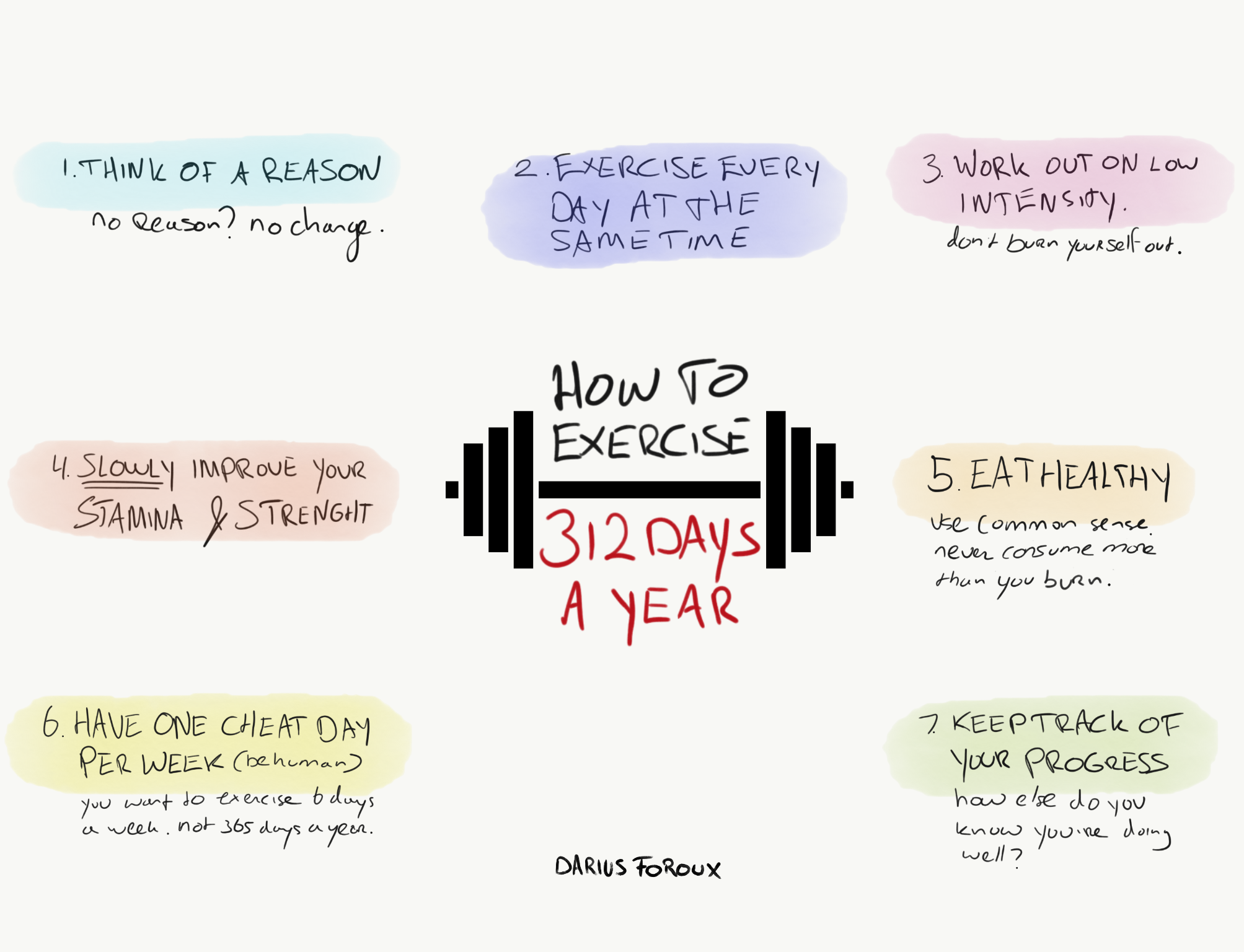 You don’t have to do the same. Just find a way to keep track of how well you’re doing. Getting a visual representation of how much you’ve exercised is very motivating and keeps up the momentum.