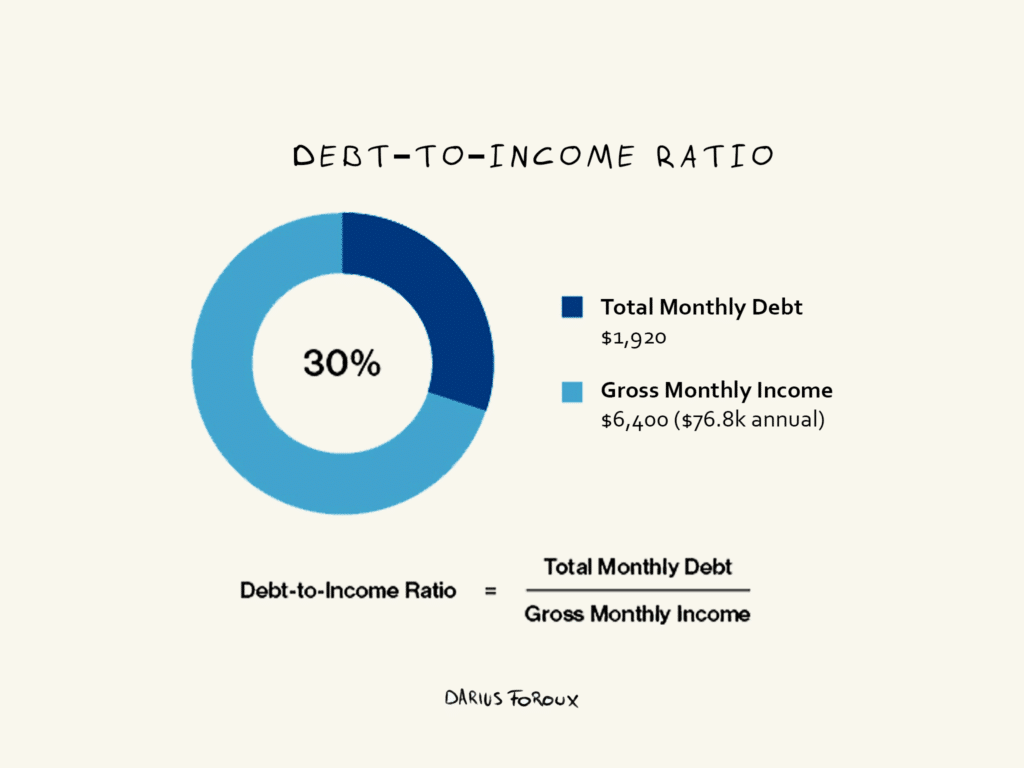 For example, if you have a total of $1,920 in monthly debt payments and earn $6,400 per month (for an annual salary of $76,800), your DTI ratio would be 30%. Your DTI ratio should ideally be below 36%, but many lenders prefer it to be even lower at around 28%.
