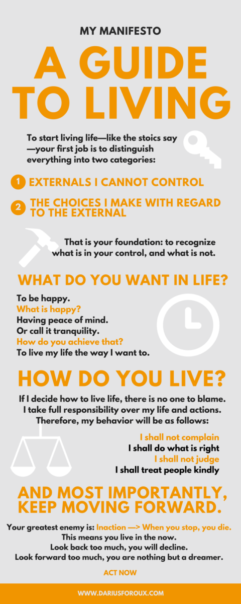 A quick look at my manifesto reminds me of the person that I choose to be. People often say, “this is how I am.” I do not agree with that statement. We CHOOSE to behave in a certain way. It’s simple as that. We decide who we want to be, and then we behave according to that role. Additionally, we are all sons, daughters, brothers, sisters, and citizens. We should behave according to our role. Epictetus says the following about this: